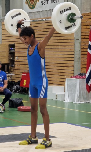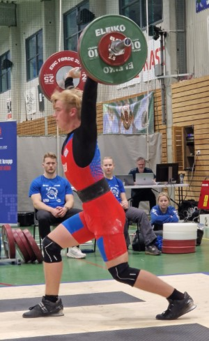 Sondre var vår mann i pulje 3, klasse 15-16år. Han har slitt litt med teknikken på trening den siste tiden og selv om lett oppvarmingsrykk ble det to bom på 82kg før det satt i tredje. I støt gikk det bedre og ble stående med 103kg etter 3 godkjente. Det var veldig tett i feltet om 3. til 5.plass så det ville bli kamp om plassene her. Fine resultater til tross, knepent bak nr 4 ble det 5.plass på Sondre.